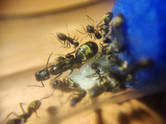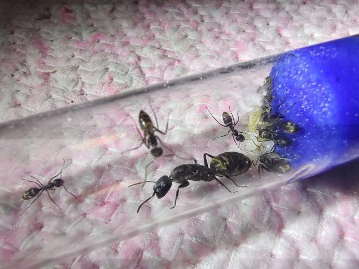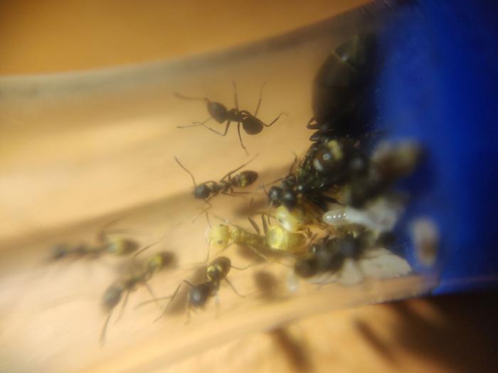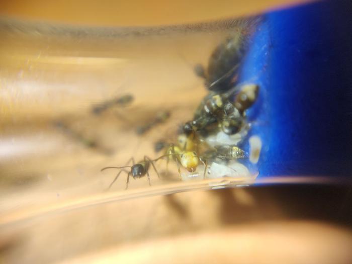 я уже и забыл что не написал ничего. Если вкратце в какой-то момент в пробирке они начали ступориться. Думал места мало - решил переселять в деревянный форм с поилкой, там начали умирать рабочие, немного, но я решил обратно переселить их в пробирку, так они и сидели, яиц так и не было. И так один за одним все рабочие умерли. Матку я старался лелеить до самого конца, у нее даже появлялись яйца(1-2 шт) но из этого ничего не вышло. Где-то месяц назад матка умерла. К сожалению я так и не понял что это был. Очень обидно ведь вид очень интересный.