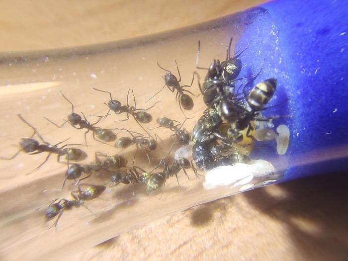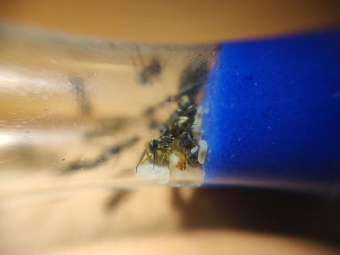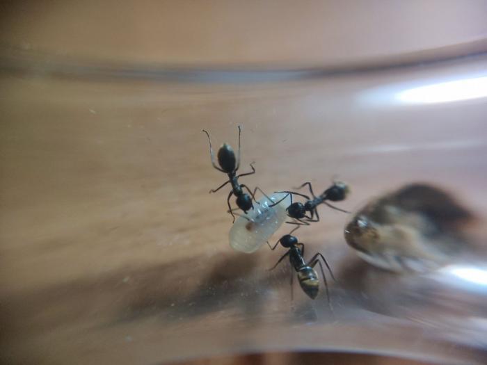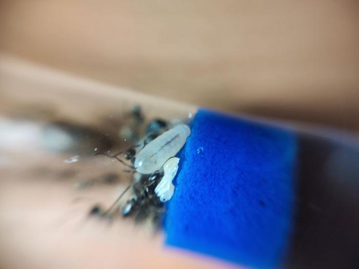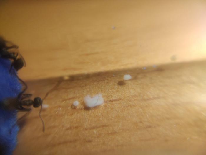 У колобков в очередной раз закончилась вода в пробирке, поэтому переселил их в пробирку с водой, во время переселения(я всегда высыпаю муравьев на арену и они сами переходят) увидел что в пробирке появились какие-то белые разводы, до переселения их не было. Я думаю это какие-то защитные выделения. Раньше видел такие у формик, при опасности появлялись белые капли на конце брюшка.