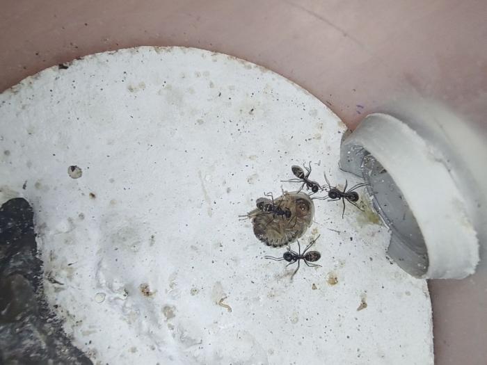 Итак, скоро у колобков появится куколка первого солдата). Семья правда ещё маленькая, но у них наверное солдаты очень рано появляются. Так же очень активно кушают, от еды не отказываются, едят и аргентинских тараканов(мелких конечно) и сахарный сироп. При употреблении сиропа брюшка у рабочих очень красиво просвечиваются. Не так как у феллахов, но тоже очень достойно.