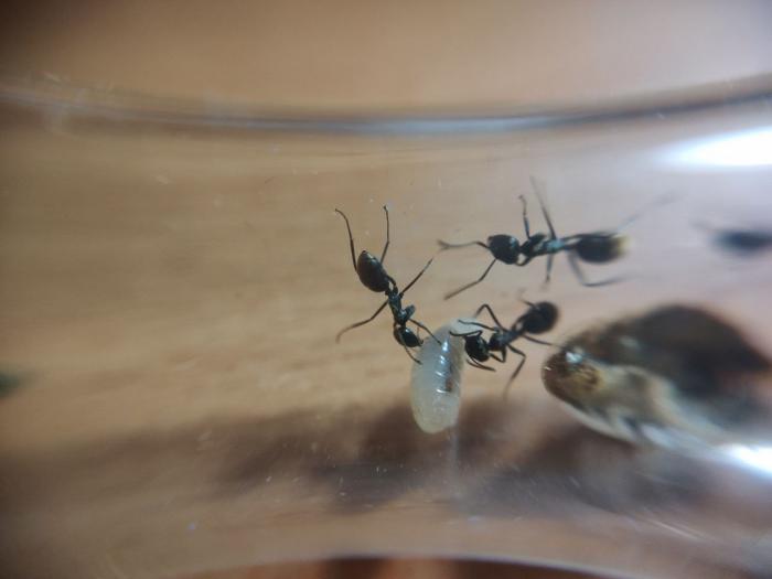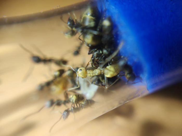 Странное поведение у колобков. Несколько рабочих обступили крупную личинку и грызли её. Читал предположение, что таким образом рабочие не дают личинке расти далее, и заставляют её окуклиться.