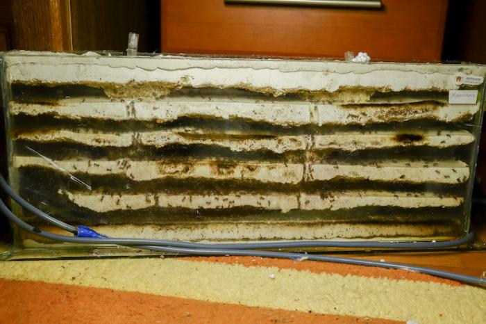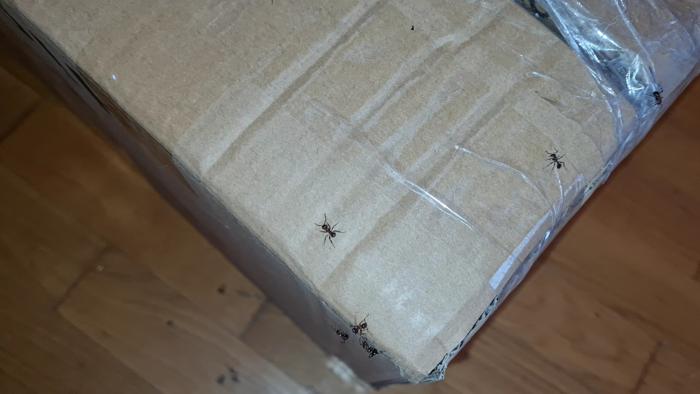 Окей, тут два варианта: либо они где-то прогрызли ватку и побежали, либо формикарий приехал не таким целым, как ожидалось. На всякий случай я вооружился скотчем, ватой, тарой с антипобегом и начал резать скотч на коробке. Открываю коробку... СКОЛЬКО ЖЕ ИХ ТАМ БЕГАЛО! Достаю формикарий и сразу понимаю, что не так. В дороге при участии гермоввода стенка фермы (та, что боковая) вдавилась во внутрь и образовалась эдакая чёрная дыра обратного действия.
