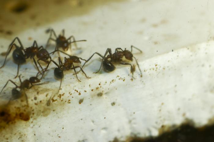 Сегодня мирмикария снесла часть расплода к тёплой стенке и вышло хоть как-то их пофоткать. Не знаю, появился ли новый расплод за то время, пока они у меня, но, думаю, с этим проблем не будет. Валера говорил, что развитие расплода у этих ребят проходит не слишком быстро (за 30 дней, или что-то вроде того), но новые поколения выходят большими партиями и благодаря этому быстро заполняют объёмы.