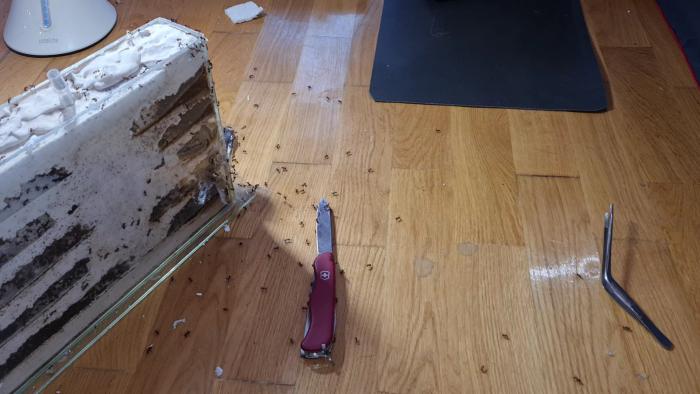 Ликвидировал проблему скотчем и поехали их собирать. Это было долго, благо мирмикария не больно кусается. К стати, мурашки эти выделяют вместо кислоты что-то непонятное, по запаху 1 в 1 как хвойная смола, у меня в начале вообще было ощущение, что ко мне приехало сосновое бревно. Но вроде никак на меня эта штука не повлияла и через часик все беглецы были отловлены.