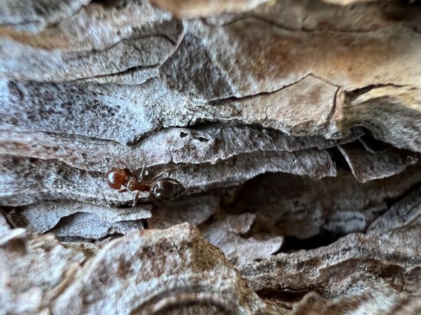 Crematogaster cf. sсhmidti, за последние полгода они у меня стали ассоциироваться с соснами, тут, на южном побережье Турции, не найдёшь и десяти сосен без хотя бы одного фуражира кремов. А если они почувствуют, что их нашли какие-то подозрительные личности, то сразу застынут на месте либо спрячутся в ближайшую складку коры (правда, это происходит не раньше, чем вы на них подуете или преградите путь пальцем). Хотя крем многочислинен и нетороплив, явно видно, что движение прерывается, а ходят они групками.