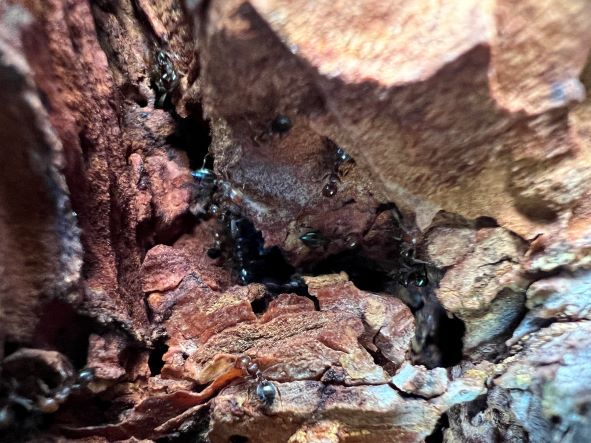 В Тбилиси, особенно в его окрестностях, много этих муравьёв, но надо приложить силы, чтобы найти их. Семьи у них не многочислены, да и живут не во всяком дереве. На хвойных их ни разу не видел, а вот кремы обожают сосны, 'часто' (кремов там на каждом шагу тоже нет, это если найдешь) можно видеть вереницы муравьёв, поднимающихся вверх. Так вот, заметил семейку в отмершей ветке грецкого ореха, второю - в стволе дерева, не могу ручаться, но вроде ясень (фото веточки приложена ).