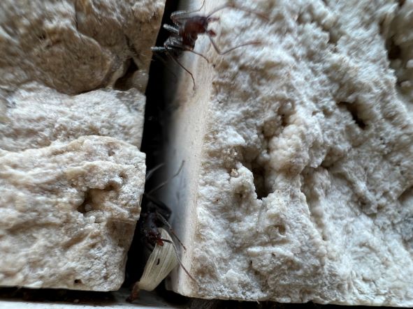 Грозные Camponotus cf samius тоже хорошо себя чувствуют у мечети вместе с фиделями, мессорами и балдачи. Не знаю чем они там питаются, но я их редко вижу и только после 6. Когда же им кажется, что на улице неблагоприятные условия (это 80% времени, когда я их прихожу проверять), выходы всегда забаррикадированы.