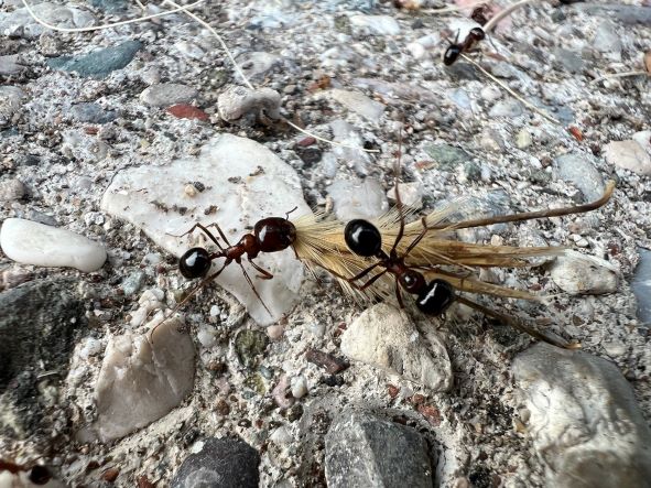 Шустрые и предприимчивые pheidole cf. indica. Этих ребят очень легко встретить в Анталии и Кемере, отлечить от паллидулы можно (намного легче) по солдатам или маткам. Лёта ещё не видел, но по дорожкам вместе с рабочими и солдатами переселялись крылатые и оплодотворённые матки, при этом их было примерно одинаковое количество. Ну, а на фотках можно увидеть их в деле, демонтаж ног и крыльев прошол очень быстро, а потом ещё быстрее жучок был доставлен в гнездо.