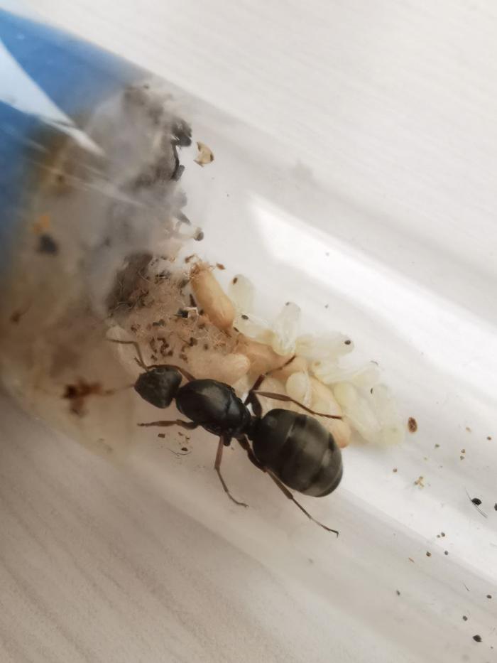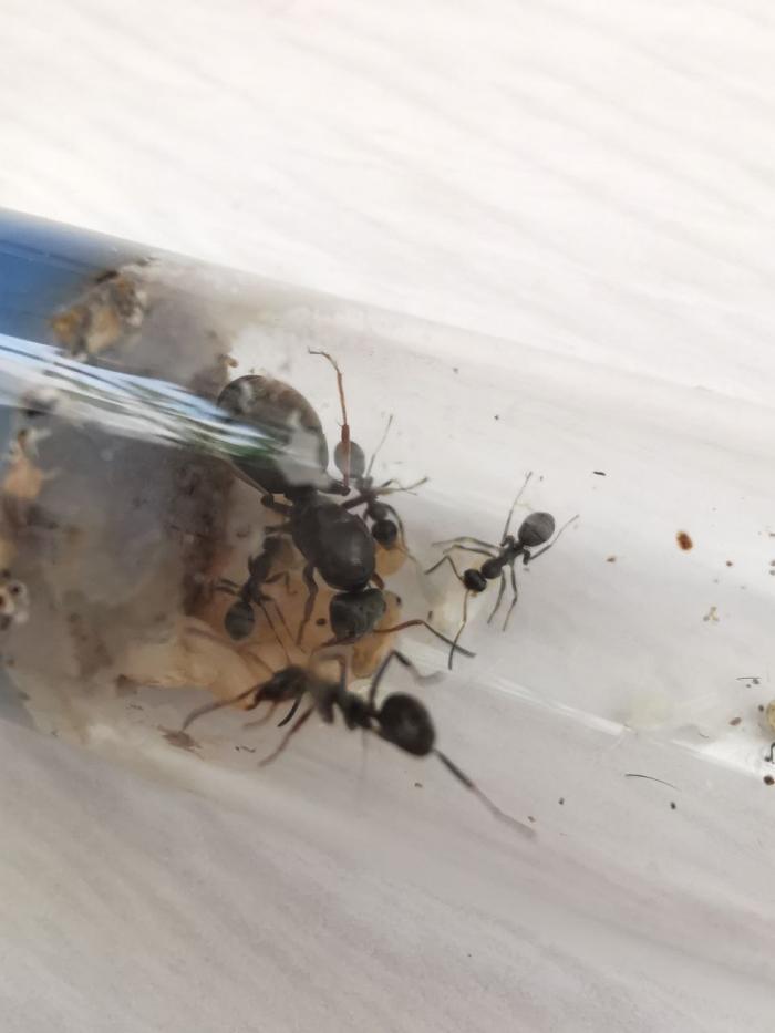 Только что переселил цинерий в новую, большую и чистую пробирку. На данный момент в семье 9-10 рабочих, 5-7 коконов и куколок, пара личинок и пакетик яиц.