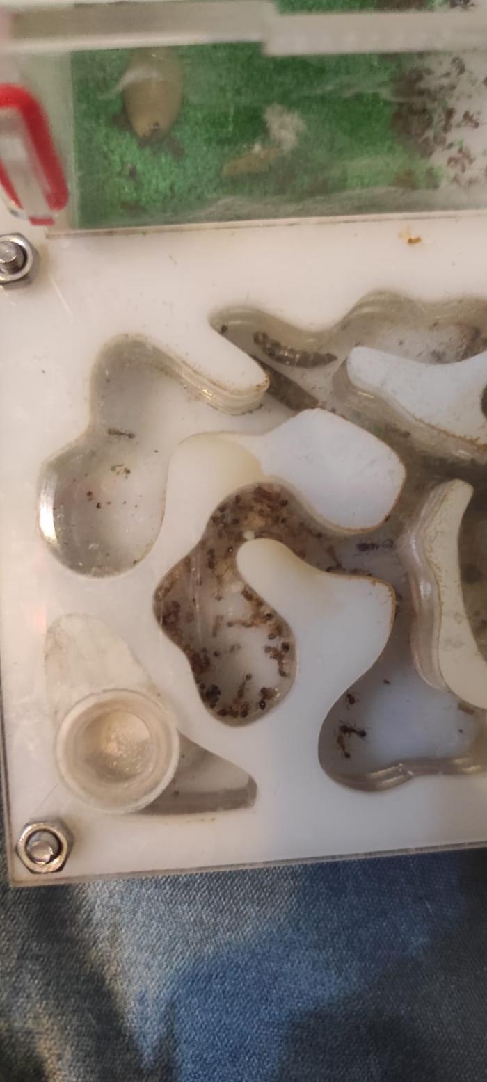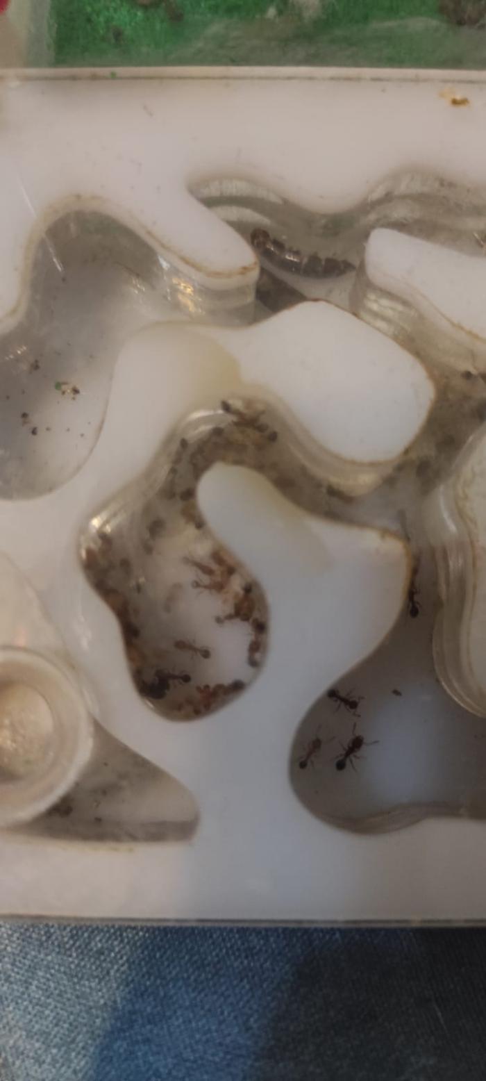 После переселения у мурах вообще пропал аппетит к белку, совсем не хотят есть, сироп пьют через "пень колоду"... Расплод имеется, крылатых нет.