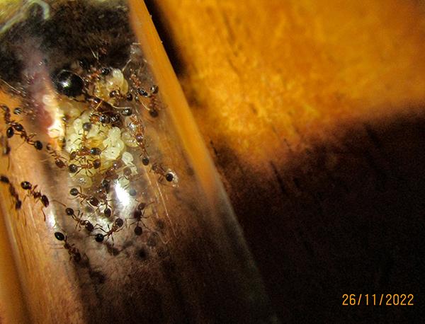 Еще летом друг (спасибо ему огромное, всегда рад новинкам) привез из Индии 2 маленькие матки, примерно 5-6 мм. Матки исправно отложили по пакету яиц и начался процесс развития: личинки, куколки, первые муравьишки. Вскоре одна из маток, по неизвестной причине, умерла. Осиротевший расплод и осиротевших десяток рабочих отправил оставшейся семье. На удивление все были приняты без проблем. С помощью нашего клубного специалиста Ивана Викторовича удалось определить даже вид муравьев. Скорее всего это Trichomyrmex aberrans внешние признаки и ареал сходятся.