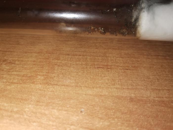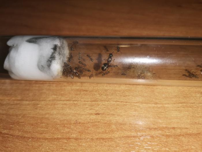 Всем привет возникла проблема с молодой колонеей serviformica sp. Совсем недавно заметил, что ватка пробирки стала фиолетовой. Сначала не придал значения, так как и прошлая пробирка фиолетовела, однако с муравьям все было хорошо. Теперь же все немного по другому. Первым звонком, что нужно начать переселение стал рост смертности рабочих. Конечно можно было это списать на то, что это первый выводок, что время этих трудяг пришло. Однако меня насторожило то, что в основном умирают муравьи с раздутым брюшком, что не естественно для сервиформик. Причём брюшка раздуваются настолько сильно, что муравьи не бегают, а таскают свое брюшко.