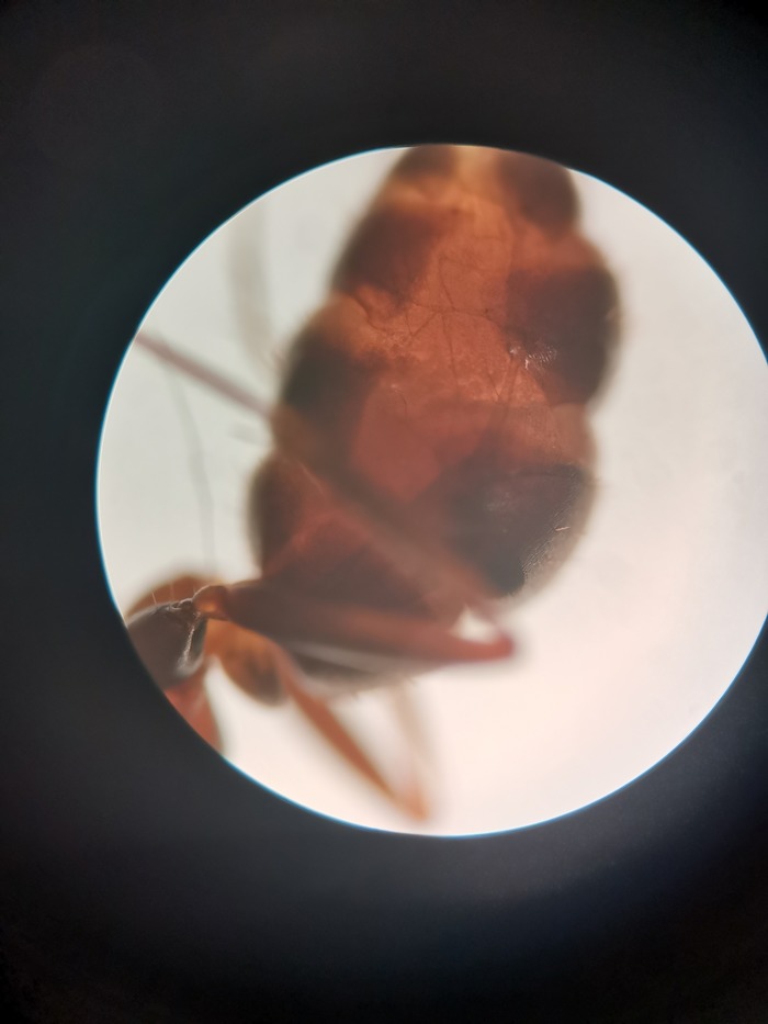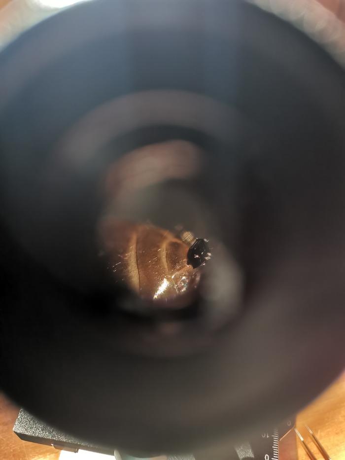 Решил тогда взять несколько экземпляров на исследование под микроскопом. Ничего сверхъестественного я не обнаружил. Только очень сильно большой мешок с какой-то жидкостью(причём муравьёв сейчас не кормлю сиропом, дабы если это болезнь не ускорить "развитие"), кроме этого пузыря, меня смутило, что у некоторых муравьёв на конце брюшка была какая-то "закупорка".