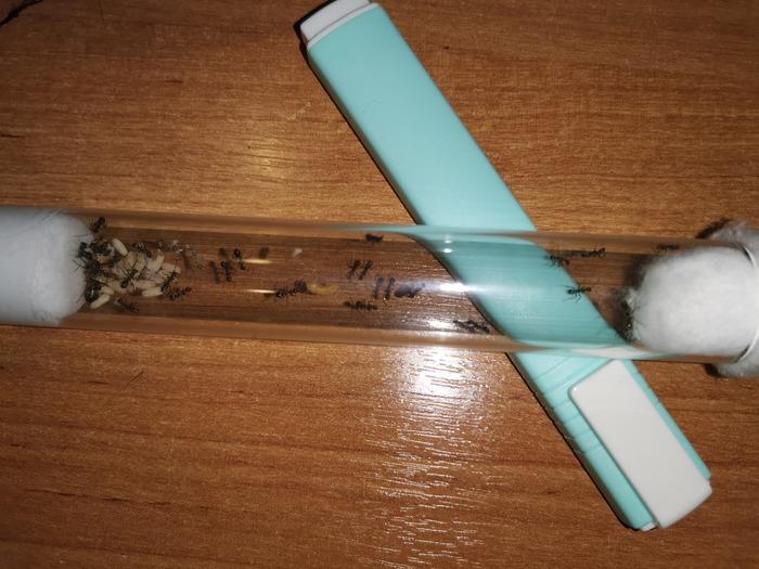 Держу сейчас я их в 20-ти миллиметровой пробирке. Муравьи находятся возле ватки. Живу за городом поэтому температура не постоянна 18 ночью, 25-27 днём. Матку поймал в начале июля. На зимовку ушли в составе матки и 12 муравьёв. После зимовки стали активно развиваться. Даже сейчас присутствуют личинки и яйца. Муравьи постоянно находятся на полке шкафа, где темно. Только когда кормлю достаю на свет, однако мурашки не из пугливых.