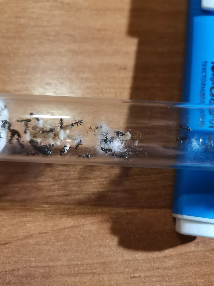 Рассмотреть было тяжело, а тем более сфоткать. Но вроде как волоски присутствуют. Плесень разрастается быстрыми темпами, но муравьёв это никак не пугает. Всё сидят на ватке с расплодом. Всё-таки переселю их завтра в новую пробирку, надеюсь смертей не будет из-за стресса.