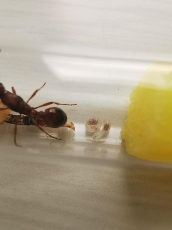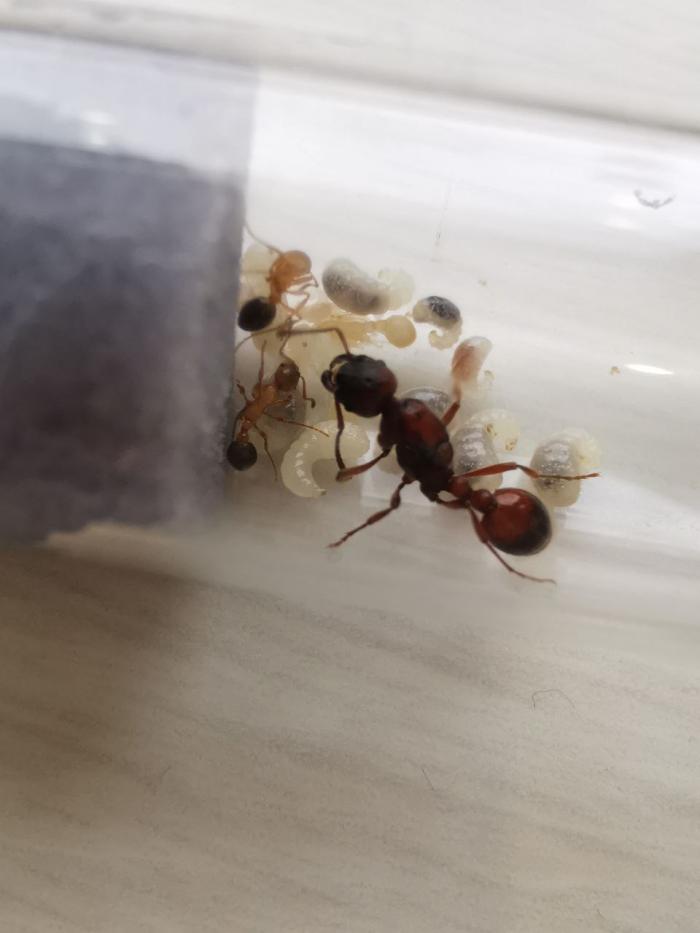 Manica rubida. Эти муравьи всегда были мечтой для меня. Они понравились мне с первого взгляда, у них суперская охота, и вообще мураши прикольные. Покупать не хотелось в виду высокой смертности и сложности содержания. Но мне подвернулась удача и я обменял свою стрикту на манику! Позавчера приехала очень агрессивная и морфная самка с двумя личинками. Сразу набросилась и изжалила бедную личинку знахаря). Личинки с удовольствием поели знахаря, после чего одна сильно увеличилась в размерах). Так же самочка попила сиропа. Надеюсь удастся поднять мою мечту)
