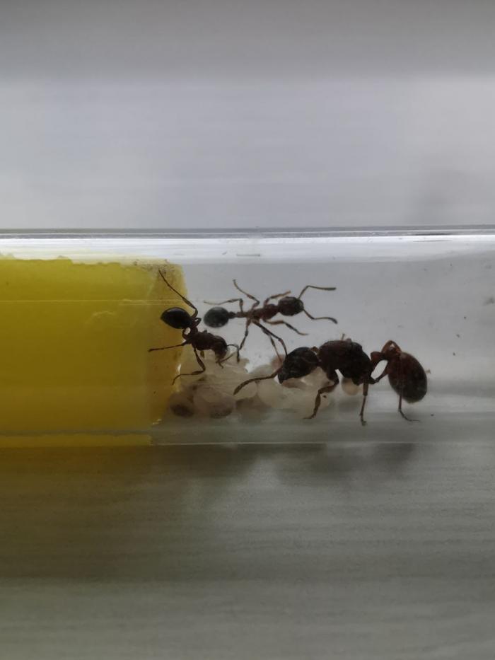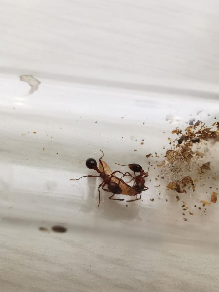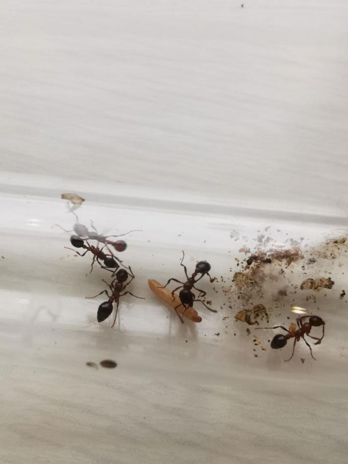 Маникам была предоставлена арена от моих Serviformica sp ( https://antclub.org/node/13073 ). Убрал их на зимовку, и чтобы не занимать место в холодильнике, а так же для того чтобы арена не простаивала, положил в холодильник только модуль. Арену же отсоединил, отмыл ее и все декорации, и отдал маникам. Пускай поживут на ней те 6 месяцев пока зимуют сервиформики, а к тому моменту я им уже и формикарий прикуплю. Сейчас состав 1/10, а так же много яиц, несколько куколок и штук 5 личинок. Некоторые из них уже выделили меконий, так что должны скоро окуклиться. На арене постоянно бегают 3-4 рабочих. Они уже сами охотятся на живого знахаря. Просто бросаю его им, несколько ударов жалами двух подоспевших работяг, и через некоторое время он уже не двигается. Далее заносится в гнездо и пожирается).