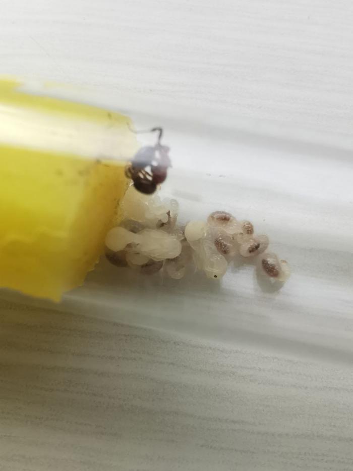 Давно не писал про маник, за это время все изменилась! Они были переселены в чистую, и более просторную пробирку. Сейчас у них уже 7 рабочих! И они не собираются останавливаться. У них много личинок, и несколько куколок, а так же большой пакет яиц. Как я заметил, во первых, в семье не может быть много куколок сразу. Маники вырастили штук 10-15 личинок готовых к окукливанию, после чего окуклились только 2-3 штуки. Когда вылупился один рабочий, окуклилась еще одна личинка. И так далее. Так же дела обстоят с яйцами. Пока всё предыдущее поколение не превратится в рабочих, они не развиваются. Только когда вылупятся последние рабочие из поколения, яйца начнут развиваться.