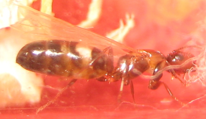 У меня тоже три таких. Я писал. Одна сбросила крылья, две -- нет. У одиночки появилось два кажется яйца. Вернее такие две длинные прозрачные штучки. Ну очень длинные яйца, но не личинки. Не движутся. У двух крылатых (сидят вместе) на двоих пять таких же яичек. Для одиночки делаю микроформикарий.