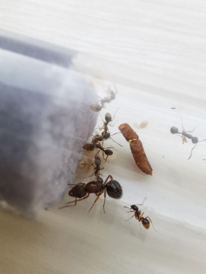 Афены растут, сейчас их 9. Совсем недавно было 10. Приличная кучка расплода, и это радует. Неделю назад были переселены из старой засраной пробирки в новую. Сейчас они стали куда смелее, не боятся придавленной личинки знахаря, и с удовольствием ее едят. На еду выходят все рабочие, так что самка остается одна. Интересно, потому что даже у более отчаянных мурашей (фейдоль например) с самкой и расплодом всегда оставалось хотя-бы несколько рабочих.