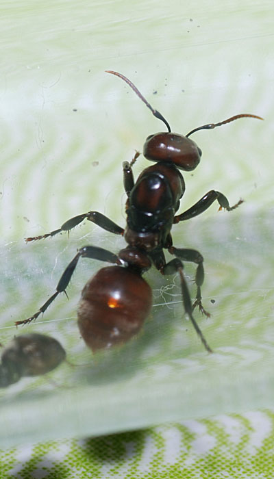 Сегодня днем 05.09.08 г около 13 часов (солнечно, ветренно, t 23-25) в МО на самой границе О-Зуевского и П-Посадского района, в сухом, сосновом, с примесью рябины, клена и елей лесу (c муравейниками или руф или близких к ним видов, с вкраплениями лазиусов ( черных и рыжых), и небольшим количеством серфиформики фуски), поймал нечто. Нечто выбежало из травы и целеустремленно стало перебегать асфальтированную дорогу, бежало быстро. Вначале я принял ее за осу немку, небольшая, чуть меньше матки руфы, по окраске напоминает ее, но более темная грудь и желтоватым брюшком, с крыльями слегка черноватыми на 1\3 у основания. Нечто было немедленно поймано за крылья (ну не помню я могут ли осы немки кусатья, поэтому обращался крайне осторожно (ногти и кожу на большом и указательном пальцах у меня, после летнего сезона, рыбалки и походов, может прожалить разве тчо шершень :)). Нечто оказалось крайне подвижным, агресивным, сильным, но повсей видимости без жала ( не видел я его, может тонкое). В результате своей подвижности оно трижды!!! вырывалось у меня из пальцев, каждый раз теряя крылья, которые впрочем наредкость легко отваливались (помниться ранее я неоднократно расматривал маток разных мурашей именно держа за крылья и ни разу они не отрывались от усилий самой матки), так без крыльев и была посажена в коробочку из под мятных таблеток Рондо, и положена на переднее сидение автомобиля, сам же я пошел посмотреть нет ли вокруг других таких нечто.... Вернувшись увидел, что оно както умудрилось выдвинуть крышку и сбежать, непостижимо!! Без надежды на успех стал искатьт нечто и что вы думаете обнаружил его бежавшим по заднему сидению, поймал, поместил в коробку, крышку зафиксировал изолентой.