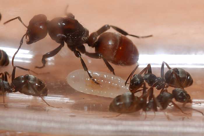 А эти во время кормежки так приподнимают головной и задний концы, что становятся похожи на египетскую лодку или драккар викингов. Мураши их постоянно вылизывают, кормять, тормошат, матка тоже старается занять положение над личинками, но рабочии их из под нее вытаскивают, и утаскивают в сторону. Колония есть мед, активно, и камаров ( их пока еще много на леснице), у меня на работе их никто не травит, так что я спокоен, как комары исчезнут, планирую перейти на тараканов, но их предстоит еще приобрести.
