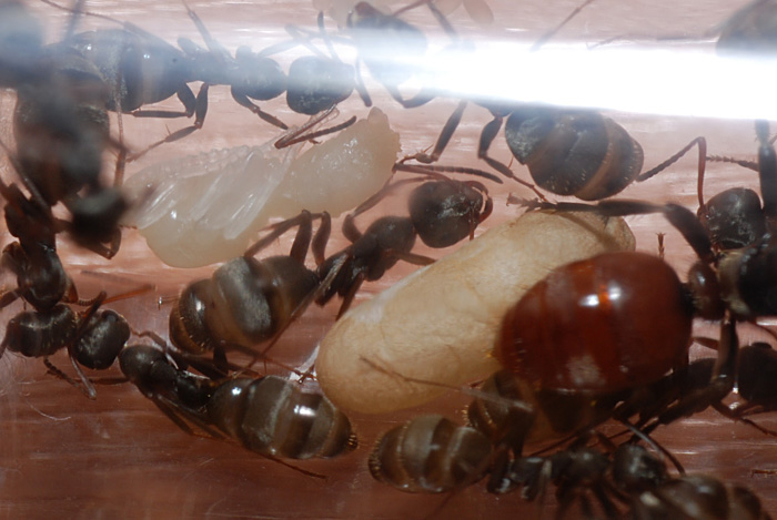 Теперь все успокоилось, матка сидит на коконах, молодой каникулярия бесцельно бродит по пробирке и пристает к врослым, фуски очень заняты, целеустремленно пытаются прорыться через ватку, видно мураши старые и пока их инстинкт гонит на поверхность, на коконы обращают мало внимания, но надеюсь, что через некоторе время переключаться на них, или в крайнем случаее молодой мураш все же сможет сам освободит своих сестер из коконов, на матку надежды мало.....