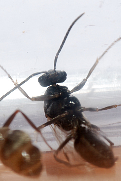 Но вначале опишу их поведение. Самы оказались предельно глупыми и суетливыми существами. Сегодня целый день, суетились, бегали по пробирке, залезали на потолок, падали на спину, суетливо пытались перевернуться, вообщем вносили сумятицу в жизнь колонии. Во второй половине дня стали настойчиво лезть на арену, откуда мураши их вначале утаскивали за усы в пробирку, но затем видно плюнули на них, выставили стражу на арене из 2-4 мурашей, и самцы как угорелые носились по арене, лезли на стены, потолок, постоянно падали в каплю меда. Мураши их оттуда вытаскивали, тащили в пробирку и вылизывали, после чего все начиналось сначала.