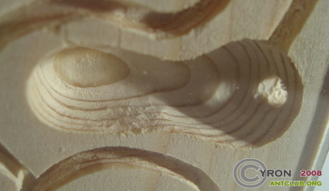 Реализовать задуманное оказалось совсем не сложно. Единственная сложность - не попасть в глубокие камеры с другой стороны (глубина камер - более половины толщины деревяшки). По этой причине пришлось несколько изменить расположение и вид камер на второй стороне ... подумал я об их расположении уже когда первая сторона была готова. Конечно же не обошлось без "неприятностей" в виде дрогнувшей фрезы и т.п. - пришлось по ходу фантазировать. Результат меня устроил, особенно для первого раза.