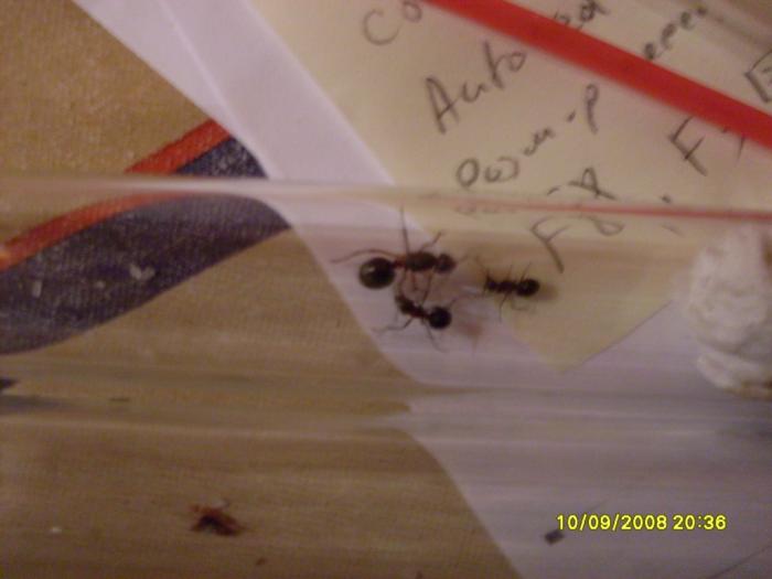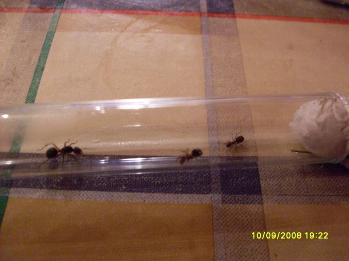 На следующий день, очень обрадовался тому, что один из муравьев больше не грызет сухую ватку, а сидит на мокрой рядом с королевой (на фото ниже этот радостный момент запечатлен). Два остальных грызли ватку. Тогда я подумал, что количество трех мурах все-таки слишком мало, поэтому я отправился в лес, к тому же муравейнику и изъял еще 4х рабочих. К тому моменту, как была подсажена первая партия муравьев, прошло чуть больше суток (я снова уезжал в город), поэтому совершенно не представлял, как поведут себя вновь подсаженные муравьи. Итак, первый мурах, был запущен и моментально атаковал матку, схватив ее за лапу. Этот момент я не упустил, поэтому срочно извлек сцепившихся, распустив при этом других муравьев по столу. В ускоренном темпе собрал разбежавшихся, поместил в другую пробирку и принялся спасать вцепившегося мураха, ибо ему грозила погибель от челюстей матки: зажал ему брюшко зубочисткой, а шприцем (сиропным) надавил на голову. Через секунду, мурах отцепился от матки и был тут же изолирован в пустую пробирку. Кстати говоря, среди них был и тот, который признал новую королеву. Далее матку поместил обратно и на этот раз решил вначале адаптировать того нападавшего муравья, а потом соединить с остальными. На этот раз, мурах не нападал на королеву, что поселило во мне надежду на успешное завершение подселения второй партии.