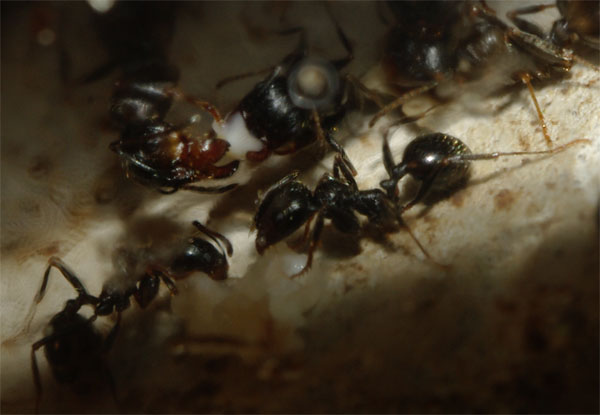Колония у меня большая. Когда кидаю очень много корма, они тащят в общую камеру... заваливают её полностью.