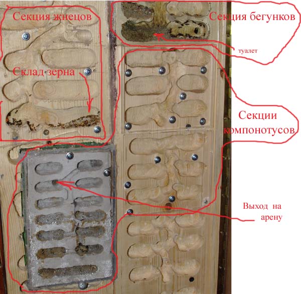 Закончил арену и переселил компонотусов. Стоило только положить пробирку на арену и открыть. Переселились в течении 15 минут при лёгкой панике. Я им предложил гипсовую секцию и две деревянные. Вернее, одну деревянную. Переход во вторую деревянную пока заткнул ваткой. Выбрали гипсовый. Причём, самую нижнюю камеру с конденсатом на стекле. (Малость переувлажнил). На фото видна ещё одна большая камера ниже той, в которой разместились муравьи, но туда нет прохода. Там только песок и маленькое отверстие в стекле для иглы шприца. Эта камера сделана для увлажнения формикария. Муравьи первый день усиленно обследовали арену, забирались во все щелочки. Потом два дня я отлавливал на крыше формикария и полу в день по три - четыре компонотуса. Причем, похоже одних и тех же. Наконец после долгих наблюдений выследил, где вылезают. Заклеил пластилином. Теперь спокойно. Усиленно уносят курятину. Сироп -- не очень. Но часто пьют конденсат со стёкол. Похоже, в пробирке им не хватало влаги. Теперь отрываются. На арену выходят редко. Два -- три фуражира. Не больше.