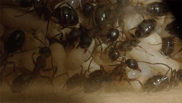 Личинок к пище прикладывают не все муравьи. В основном это присуще так называемым примитивным видам (понеры, дракула-антс, мирмеции и многие дургие, которых я пока помню только визуально...). Лазиусы часто ложат кусочки на кучу личишинок. Кампонотус обычно обрабатывает пищу прежде, чем дать ее личинкам. Если вы заметили, то личинки кампонотуса имеют отличную от други личинок форму: у них на груди есть некое подобие мисочки, "шея" личинки изгибается как раз над ней (такой характерный только для кампонотуса изгиб). Особенно хорошо это видно на личинках солдат и маток. Так вот пища обычно переминается, делится на небольшие кусочки и дается каждой личинке. Углеводным кормом кормят их также, как и взрослых муравьев.