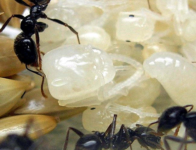 Наверное, это не основной корм, в основной корм для канареек входят просо и канареечное семя, здесь его вообще нет. Чем корм разнообразней, тем лучше, думаю муравьи не исключение, выберут то, что им нужно. Желательно добавить овес или овсяные хлопья "Геркулес" - мои Мессоры их размачивали и кормили личинок. Заметил, что предпочтения у них меняются, то тыквенные семена едят с удовольствием, то на мак переключаются, то вообще не знаю что – в разжеванном виде не понятно (третье фото снизу "Подготовка корма для личинок"). Через день, подкармливаю курицей или креветкой.