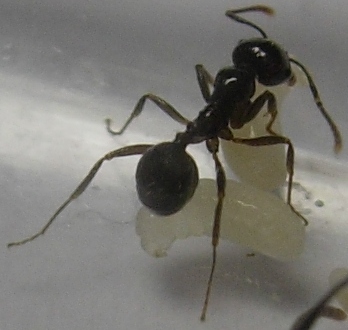 Сегодня обнаружил, что две личинки окуклились. Кормление - за ночь размочил канареечное зерно, одно, без шелухи дал муравьям. Муравей вообще не отходит от приплода, ухаживает, а вот матка заинтересовалась и немного поела (точнее пооблизывала) зерно.