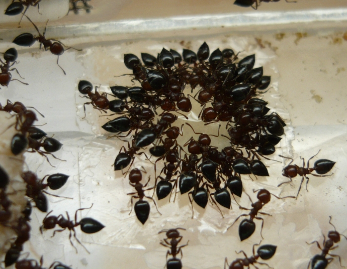 Колония растет. Сейчас в ней около 50 муравьев. Едят грецкие орехи и креветок. Самое приятное, что не зсыпают сиропные капли мусором. Хоть и считаются южными, но почему-то не любят греться. Сидят в противоположной от обогреваемой стенки стороне. Шнур греет довольно слабо, поэтому ожегов там быть не должно.
