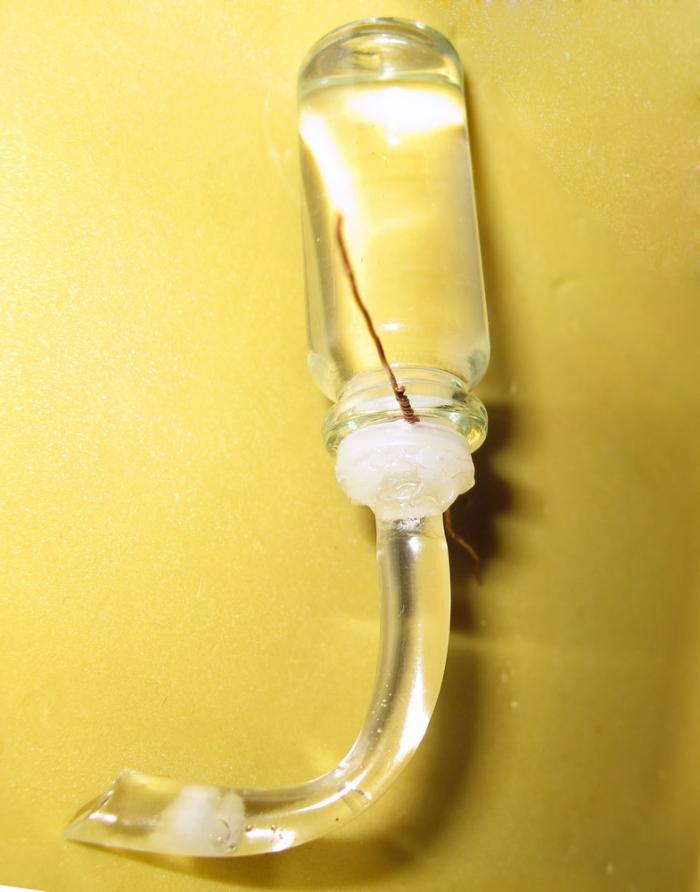 4. Вставляем деформированную трубочку в продырявленую пробочку. Делаем крепления из проволоки