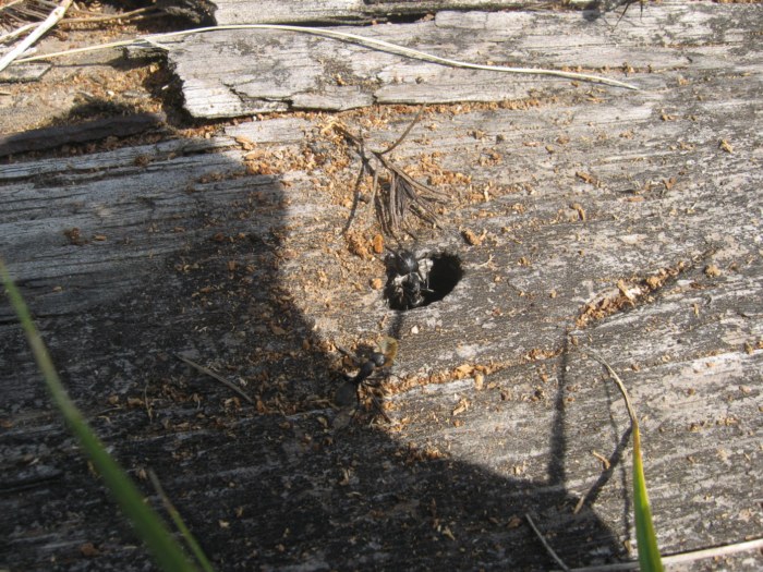 На 8-ом фото вход в гнездо, которое расположено под шпалой, в заброшенной железной дороге. На последнем фото бревно с другим гнездом.
