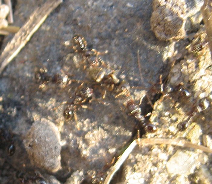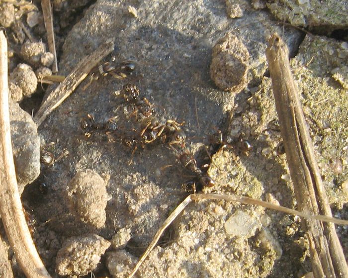 Итак началась весна, и муравейники начали постепенно просыпаться. Уже давно проснулись вездесущие лазиусы, а вчера впервые увидел тетрамориумов, которые занимались обновлением своих муравейников. Интересно что муравейник тетр, там где я их наблюдал (за домом на дворе), расположен совсем недалеко от гнезда лазиусов, и расстояние между ними составляет вего около одного метра. Поэтому муравьи из разных муравейников часто сталкиваются, и в результате этого возникают небольшие стычки.