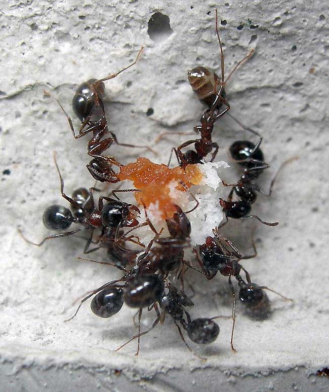 Этой колонии Denticulatus-ов шесть лет, а у меня семейка с января 2009 года. Формикарий стоит на работе, домой их забираю в летние каникулы. Семья все шесть лет живет в одном и том-же жилище, и жильцами уже давно заполнены обе его стороны, но не смотря на это, всегда есть расплод на разных стадиях развития. На фото в основном обратная сторона форма - там стекла почище. Что интересно, эта семья еще не выводила крылатых, в то время как другие мессоры выводили их уже на следующий год, при довольно небольшой численности. Честно говоря, это меня радует.