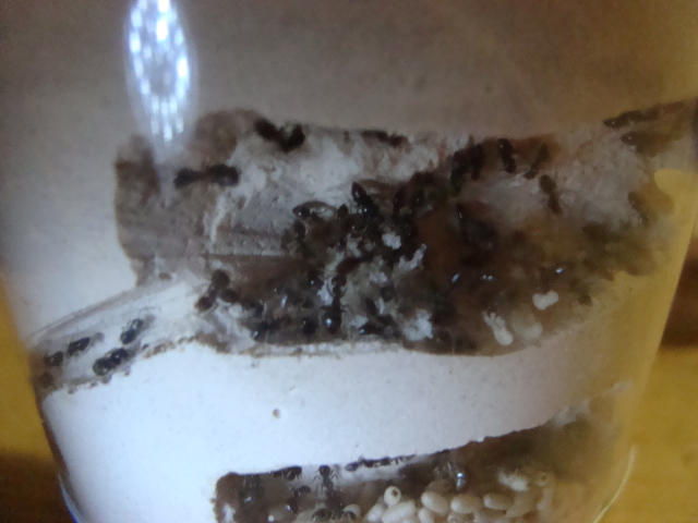 Сначала самки жили в пробирках,но когда я заметил,что муравьям не хватает влажности воздуха(они были какие то вятые,пересушенные,хоть я и потоянно делал дополнительное увлажнение из капель воды- видимо я оч плотно затромбовал ватку и вода плохо проходила),то пересодил их: одну семью в банку с небольшим количеством неплодородной земли(флавусы),а другую в мини формикарий из гипса.Когда самки были в пробирках,то отложили по кучке яиц,а из-за плохих условий содержания их съели или отдали личинкам,которые были подброшены с рабочими(теперь я немного желею что личинок подкинул,нужно подкидывать коконы или оч маленькое количество личинок).Сечас стало очень заметна высокая активность муравьёв,самки снова отложили яйца,особенно много со флавусами(там условия поестественней,и рабочих намного больше(я потом ещё подкидывал-флавусы оч дружелюбные-принимают отлично)).