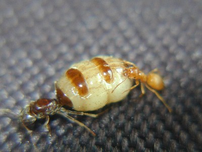 На данный момент брюшко самки так сильно раздулось,что она стала похожа на молодую самку нигера(по габаритам).Ещё бы ведь с ней не 15 рабочих (в начале было),а несколько десятков,которые постоянно пичкают ее едой.Отложила небольшую кладку яиц,но думаю это не всё.