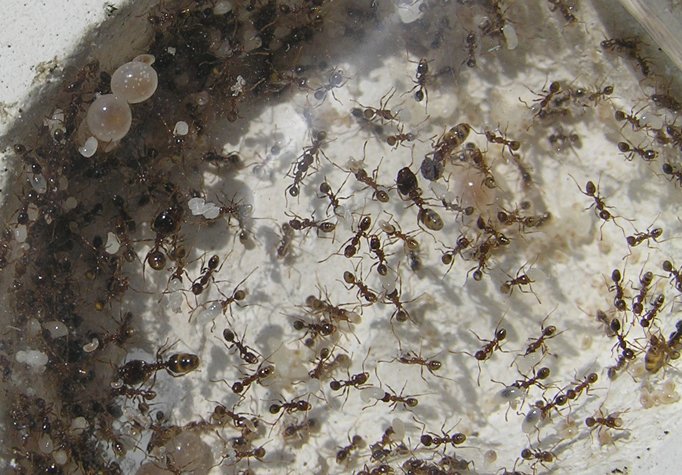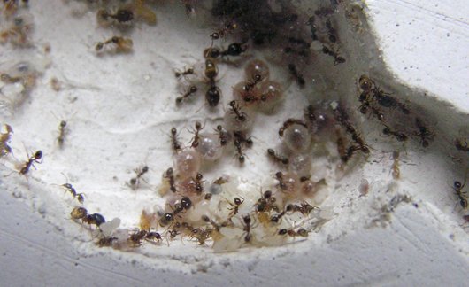 Пока семья приживалась, прошло примерно около недели. За это время муравьи очень плохо ели, практически не развивались, толком не было кладок. Потом как-то всё выровнялось, и семья стала активно есть всё, что ей дашь. Какое-то время их вообще не проверял (форм стоит закрытым), просто кидал на арену корм и всё (в камеры не заглядывал), но в один прекрасный момент обнаружил следующую картину: