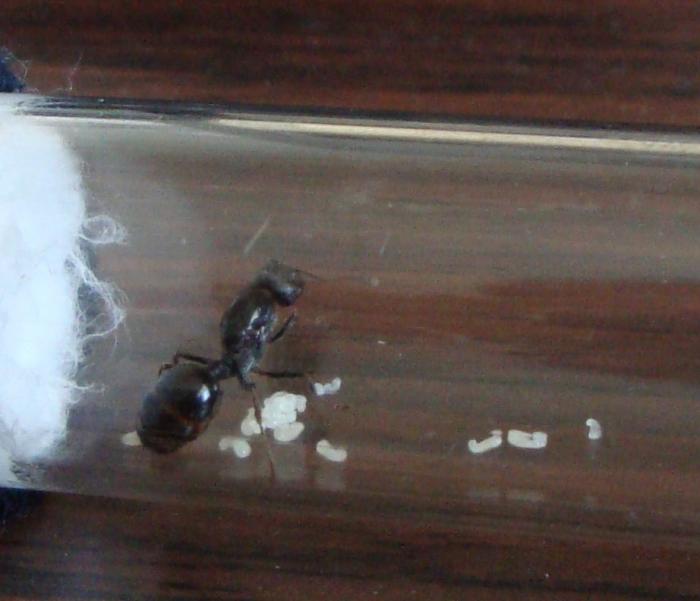Матка очень хозяйственная. Потеряв рабочего (умер скорее всего от старости), с большим аппетитом съела вчера курицу гриль. Личинки порядочно долго не появлялись из яиц, Положил в пробирку мокрую вату для повышения влажности, и вот они. Очень хочется чтобы среди них был хоть один солдат. Неплохо относится к яблоку. "Канареечный букет" пока не пользуется большой популярностью