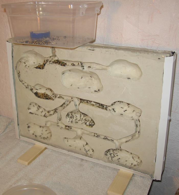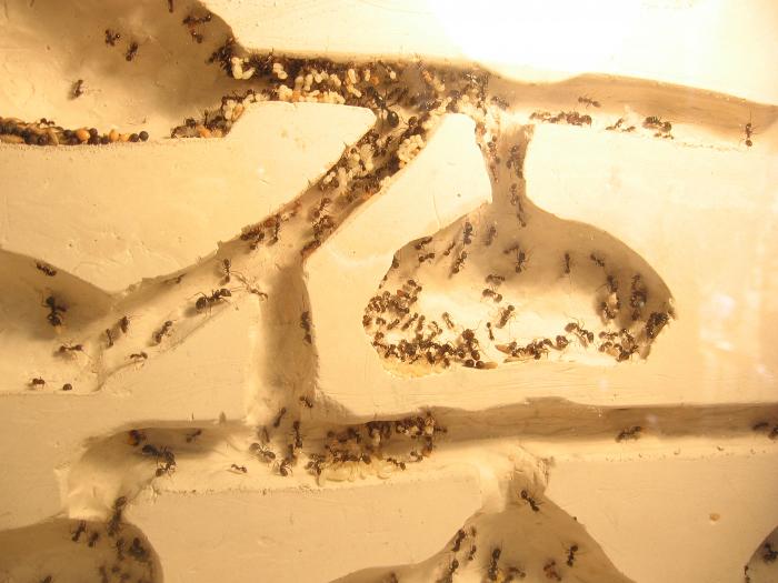 Сегодня подключил им формикарий на 10 камер (камеры довольно глубокие - до 2.5 см). Каркас сделан из кабель-канала. Камеры "лепил" из пластилина. Т.к. Мессоры плохо лазят по вертикали, старался делать проходы максимально горизонтальными. При подключении нового жилища, на разведку пошло не менее 150 мурашей. За ночь переселились почти полностью. Остались лишь пакеты с яйцами и очень мелкие личинки + 30 рабочих которые за ними ухаживают. Предположительно влажность не подходит, поэтому не переносят. В добавок несколько фоток: