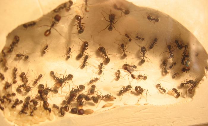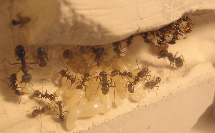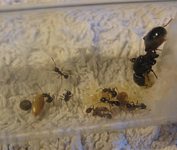 Численность семьи - 35-40. Сначала давал дрозофил ( 10-15 шт. каждый день) - ели прекрасно, после - добавил к белковому рациону маленьких тараканчиков. Результат был таков: дрозофилы на мусорке, тараканы - любимый корм.