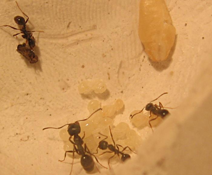 В связи с тем что колония тормознула в развитии, из-за меня (все связано с увлажнением), в ней сейчас всего рабочих\солдат 100+... Тормоза в развитии дали плохие результаты, 1-2 недели не было свежих яиц, поэтому куколки и личинки превратились в муравьев, а когда я заметил траблы с увлажнением и все исправил, я получил 3 огромных пакета яиц. Поэтому кое какое время не было новорожденных :( . Но сейчас все наладилось и есть все стадии развития. Несколько фото:
