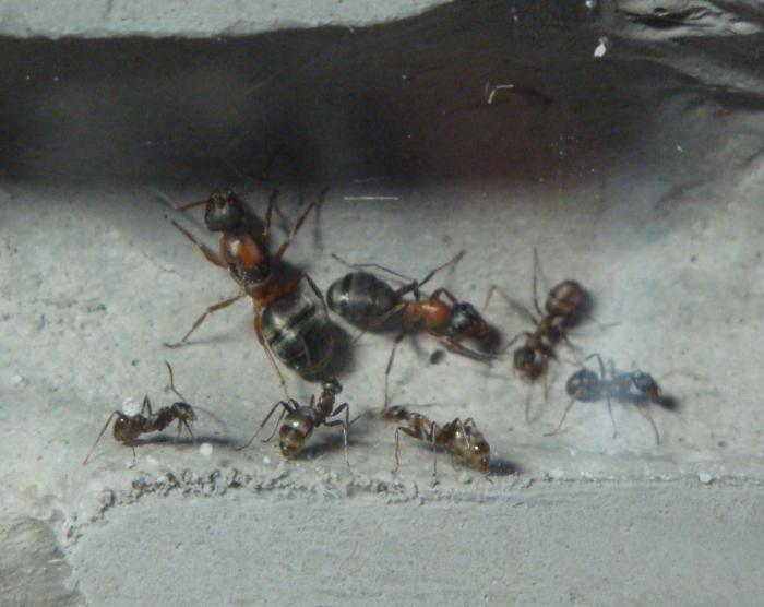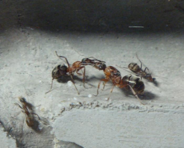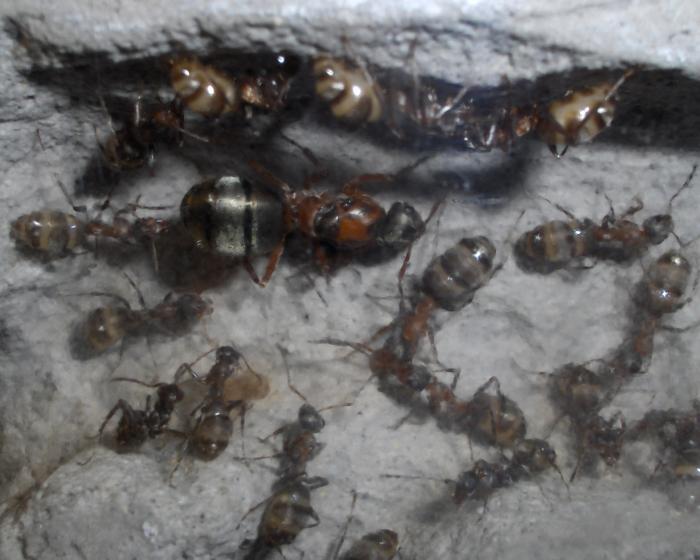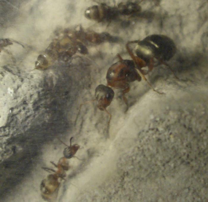 2. А здесь получилось более или менее нормально сделать макрофото муравьёв. Посему прошу знатоков помочь определить по ней видовую принадлежность данных муравьёв, т.к. я их прозвал руфибарбисами чисто гипотетически, а знать кого я точно содержу очень хочется. Кстати на этой фотке самый крупный рабочий из всей семьи, по размерам он сопоставим с первым рабочим-наёмником (см начало темы)
