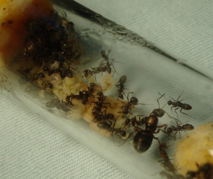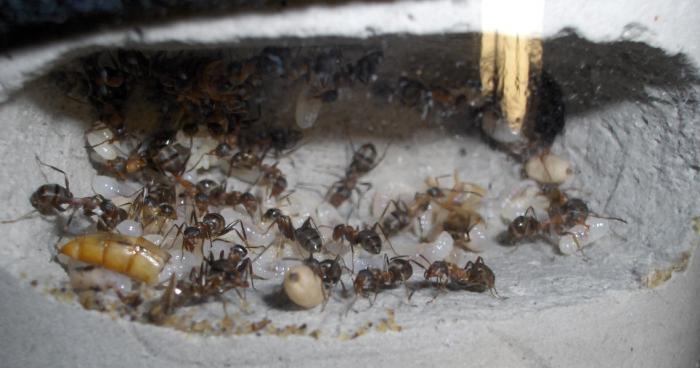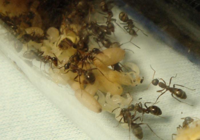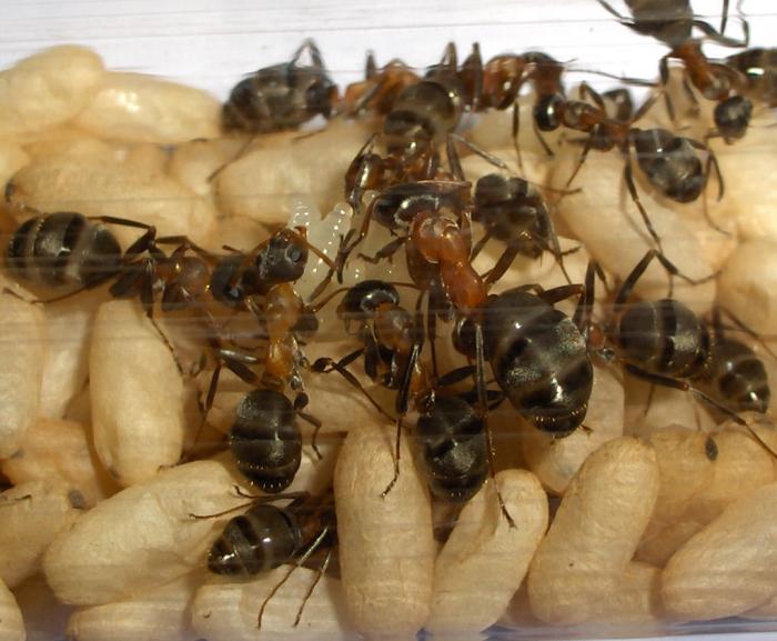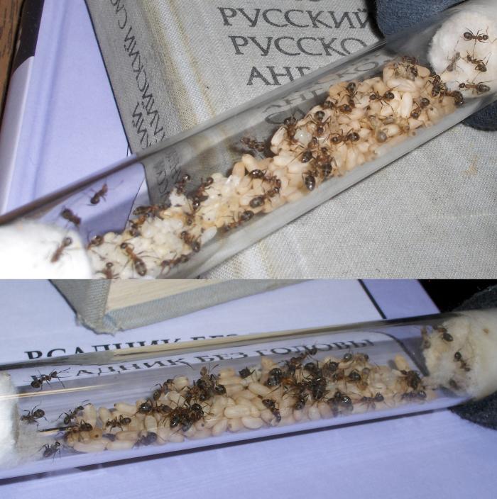 Приёмный рабочий ведёт себя как свой, кормит матку постоянно, чистят друг друга, к тому же он играет роль бочки с питательными веществами. Матка спокойная, недёрганная. Я мог попробовать ещё парочку усыновить, но в пробирке было мало места, да и зачем их много в начале. К тому же опасался, что сгрызуться со временем с маткой.