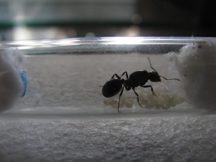 Интересный момент был, я переселял их в другую пробирку(чистую)+арену подключал. Часть муравьёв запихал в пробирку, а часть высадил на арену. Те муравью, которые находились в пробирке вышли через трубку и начали таскать "за шиворот" тех что на арене в пробирку. Подносит к матке и отпускает. Штук 5-6 так затащили, причём, когда один хватает другого за голову, тот как будто парализуется и его тащат как трупик.