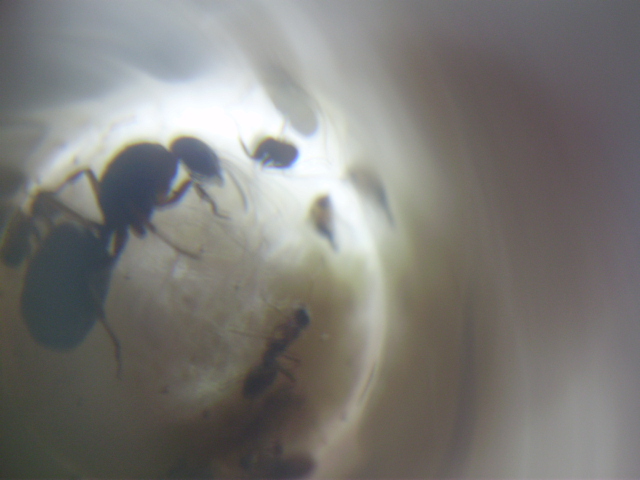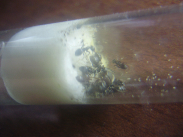 Всем привет. Здесь я буду описывать жизнь моих мурах.Колония №1 это Serviformica cunicularia, колония №2 Lasius niger. Куникулярию я нашел ппод камнем в середине июня. По приезду домой я ее посадил в пробирку и где-то через час она отложила яйца. Гдето раз в 3-4дня я ей давал медку и 1 раз в неделю дрозофилку.Но потом я уехал недели на две и по приезду сразу-же кинулся смотреть как она там.Все было нормаль рядом с маткой лежало много куколок.Дня через 3-4 вивелось 3 муравьишки. Потом каждый день по одному. Наконец все куколки вылупились мурах было 11. Наследующий день после появления последнего мураха я нашел пакет яиц. Все было норм все активно питались. Но как-то раз осматривая мурашей я заметил что один лежит скрученный аля куколка.Я его вытряхнул потрогал пинцетом и чудо он ожил хз что это было ну я его обратно кинул он побежал к остальным. Дня через 2 я снова у видел что кто-то лежит скрученый я достал скрюченного но тот не ожил((. Больше проишествий пока нет. На сегодня в семье 2куколки несколько личинок. Сфотать неудобно поэтому выкладываю фотки постарей.